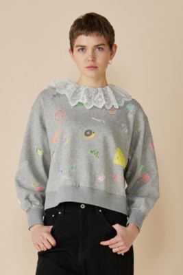 レース襟付き落書きプリントスウェットプルオーバー