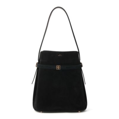Belted suede bucket bag