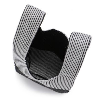 SPURSHOPでは一番人気のスモールサイズを、特別に上下のバイカラーでオーダーした。京都で生産されてきた金銀糸をヒントに、最先端の技術を用いて開発したラメ糸を使用。細かな柄表現が可能な特殊な編み機で編み立てた。裏側は逆の配色になっており、シルバーの後ろから黒がのぞくことで深みのある色合いを演出する。横への伸縮性が高くなる設計で、見た目以上の収納力を発揮するのも素晴らしい。端材を再利用したレザーストラップの長さを調節すれば、ショルダーやクロスボディとして携えることも。
