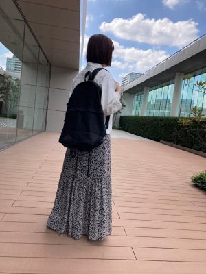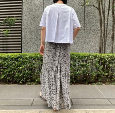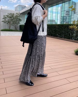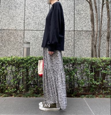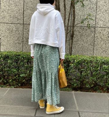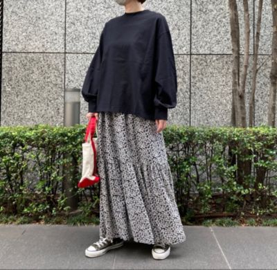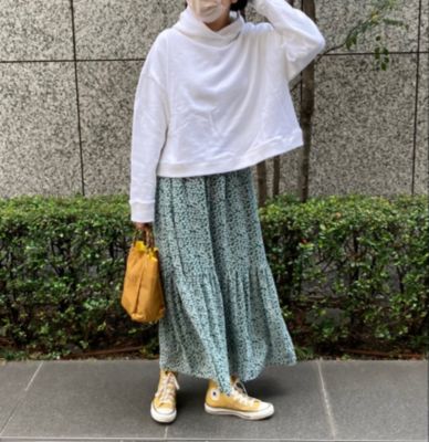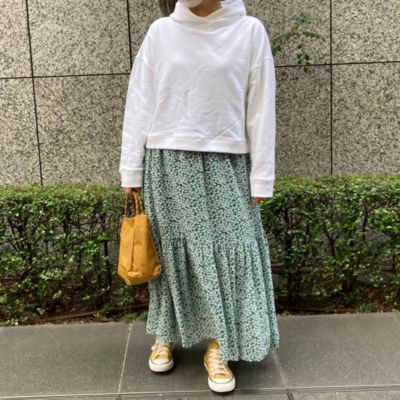 - スポーティなアウターやスニーカーでも一瞬で女性らしさが高まるような華やかなスカート。花柄といっても小さめ&地色がグリーンなので甘すぎず、お仕事にも使いやすくておすすめです。落ち感のある素材はTシャツとも相性がよく、夏のヘビーユースは確実!(LEEマルシェ店長 ぽんちゃん)