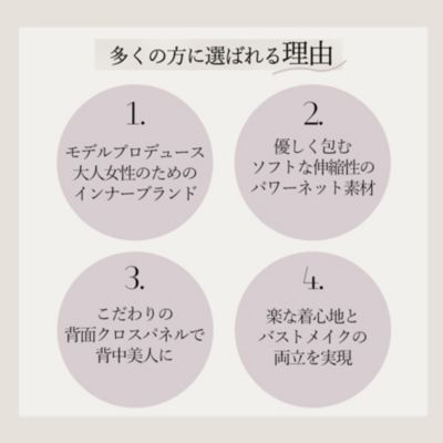 ワイヤーの役割をするパワーネットがカップを立体形状にキープします。着用した際、カップをサイドから中心に寄せるので効果的にバストメイク。