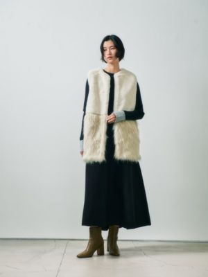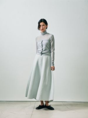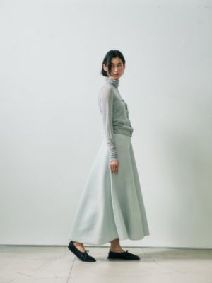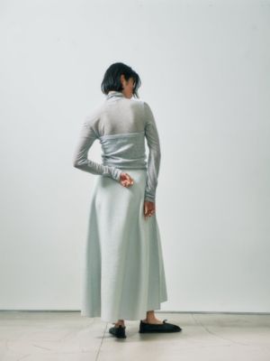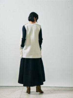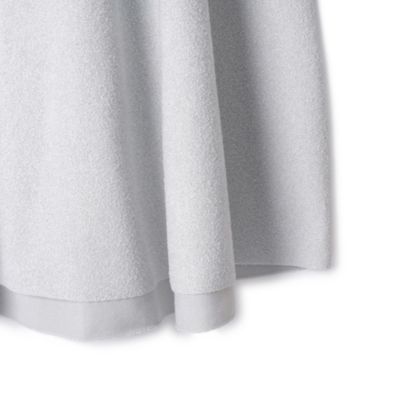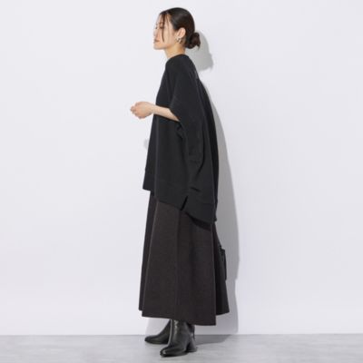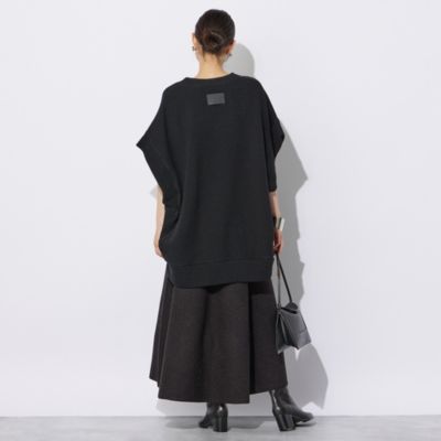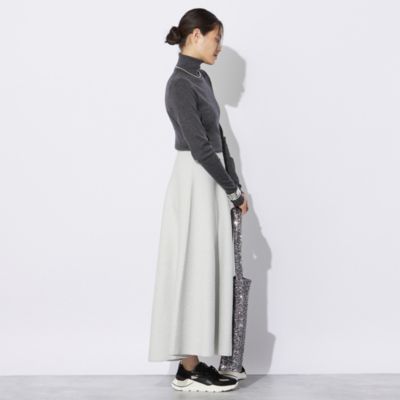 - ラメブークレのダブルフェイスニット。裏にポリエステル糸を使用、滑り良く仕上げました。ニッティングでフレアを作り、後ろスカートは長めで前後差あるレングス。