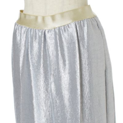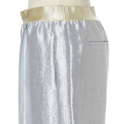 - サテンのようなキラキラとした光沢感がありつつ、縦に凹凸感のある生地を採用することで雰囲気のある輝きに。着こなしやすいワイドシルエットで、センタープレス入りなので、ウエストゴム仕様でもきれいめにはける。同素材の切り替えで表現した側章がポイント。縦のラインを強調し、脚がすっきり長く見える。