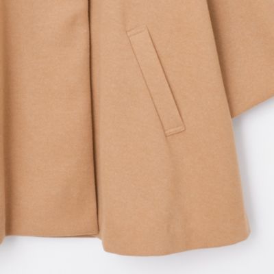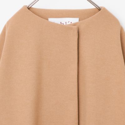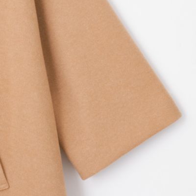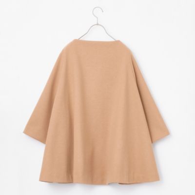 - ウール見えするダンボールニット生地で仕立てた、さっと羽織るだけでサマになるハーフコート。裾に向かって広がるテントシルエットで、合わせの深いフロントは大きめのスナップで開閉する作りになっています。素材や明るいキャメル色に加え、ノーカラー、七分袖、腰まわりをカバーする短めの着丈など、品よく軽やかに着られるポイントが随所に。